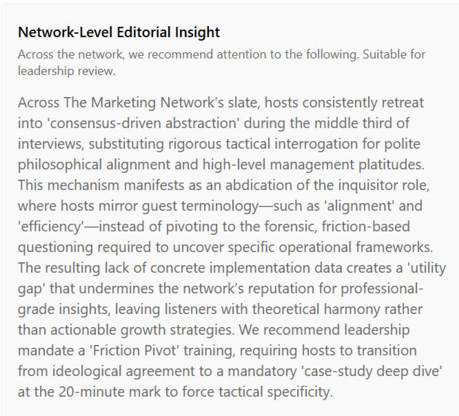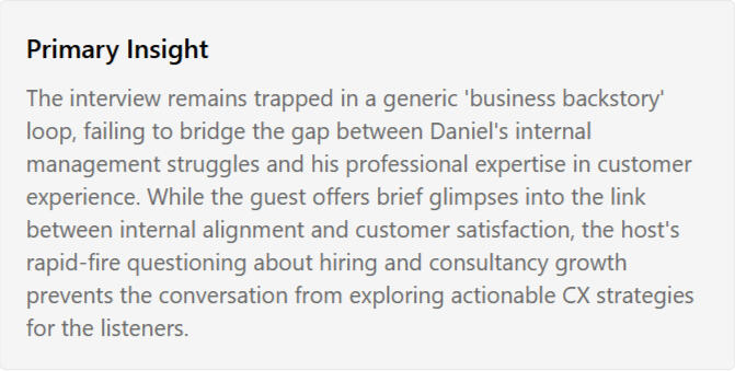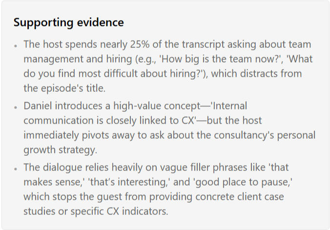 A decisive judgment on the episode’s clarity, focus, and overall effectiveness — including the single biggest constraint holding it back.Output: A clear call. Not a neutral recap.