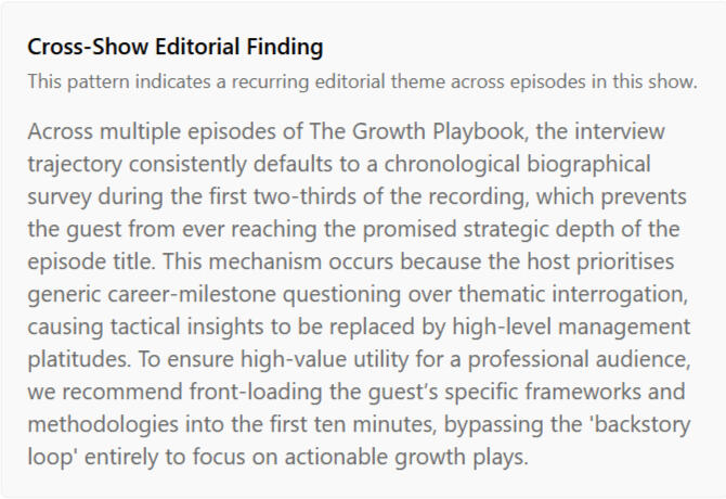 Recurring editorial signals across episodes or shows — format strengths, pacing issues, and structural habits that compound over time.Output: A repeatable pattern you can fix once and improve across multiple episodes.