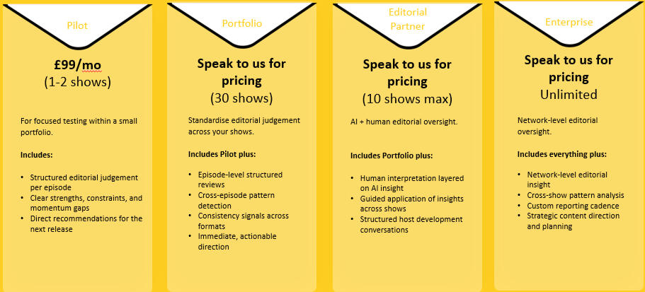 Whether you oversee a single show or a full network, PodCritic gives you the clarity to move faster, standardise decisions, and reduce subjective editorial debate.Structured editorial judgement — applied consistently across your portfolio.